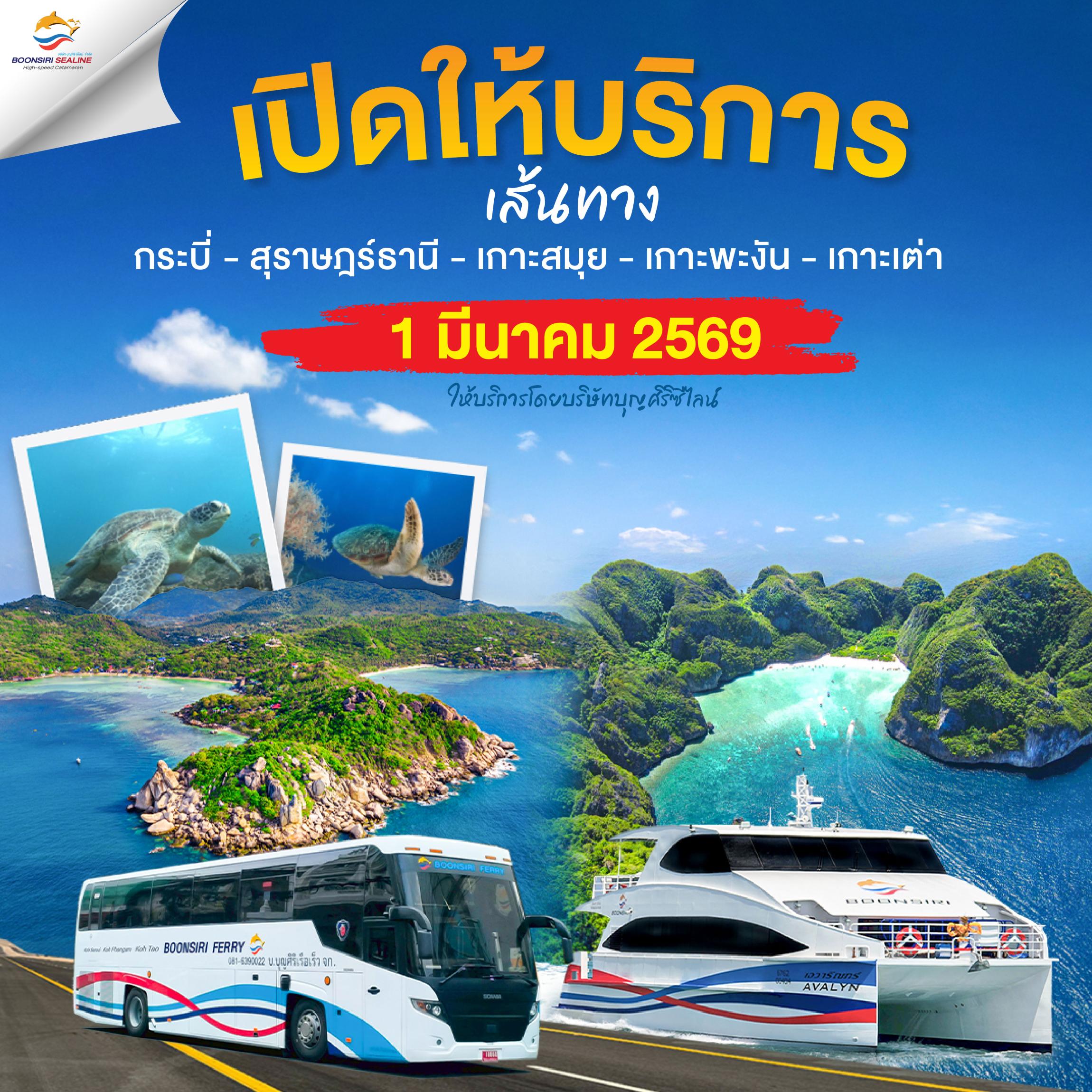 Great news for beach lovers and island hoppers! Boonsiri High Speed Ferries (Boonsiri Sealine) has officially launched a brand-new joint ticket route connecting the Andaman Sea to the Gulf of Thailand. Traveling from Krabi to Surat Thani, Koh Samui, Koh Phangan, and Koh Tao has never been easier. Opened on March 1, 2026, this service combines a VIP air-conditioned bus with a high-speed catamaran for a seamless, hassle-free journey.