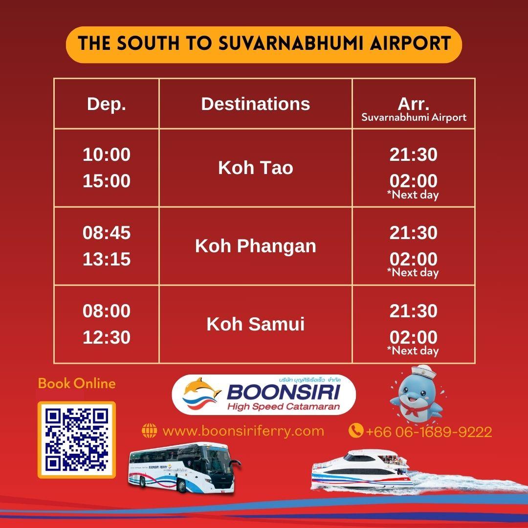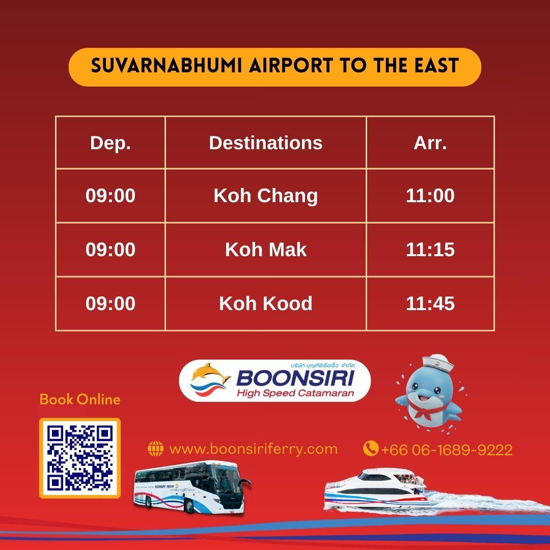 การเดินทางจากกรุงเทพฯ ไปยังเกาะสวรรค์อย่าง เกาะกูด, เกาะช้าง หรือ เกาะเต่า มักจะเป็นเรื่องวุ่นวายที่ต้องฝ่ารถติดไปยังสถานีขนส่ง แต่บริการใหม่ล่าสุดจาก บุญศิริเรือเร็ว (Boonsiri High Speed Catamaran) จะเปลี่ยนประสบการณ์การเดินทางของคุณ ด้วยบริการรถบัสรับส่งตรงจาก สนามบินสุวรรณภูมิ (Suvarnabhumi Airport) เชื่อมต่อสู่ท่าเรือเฟอร์รี่ทันที